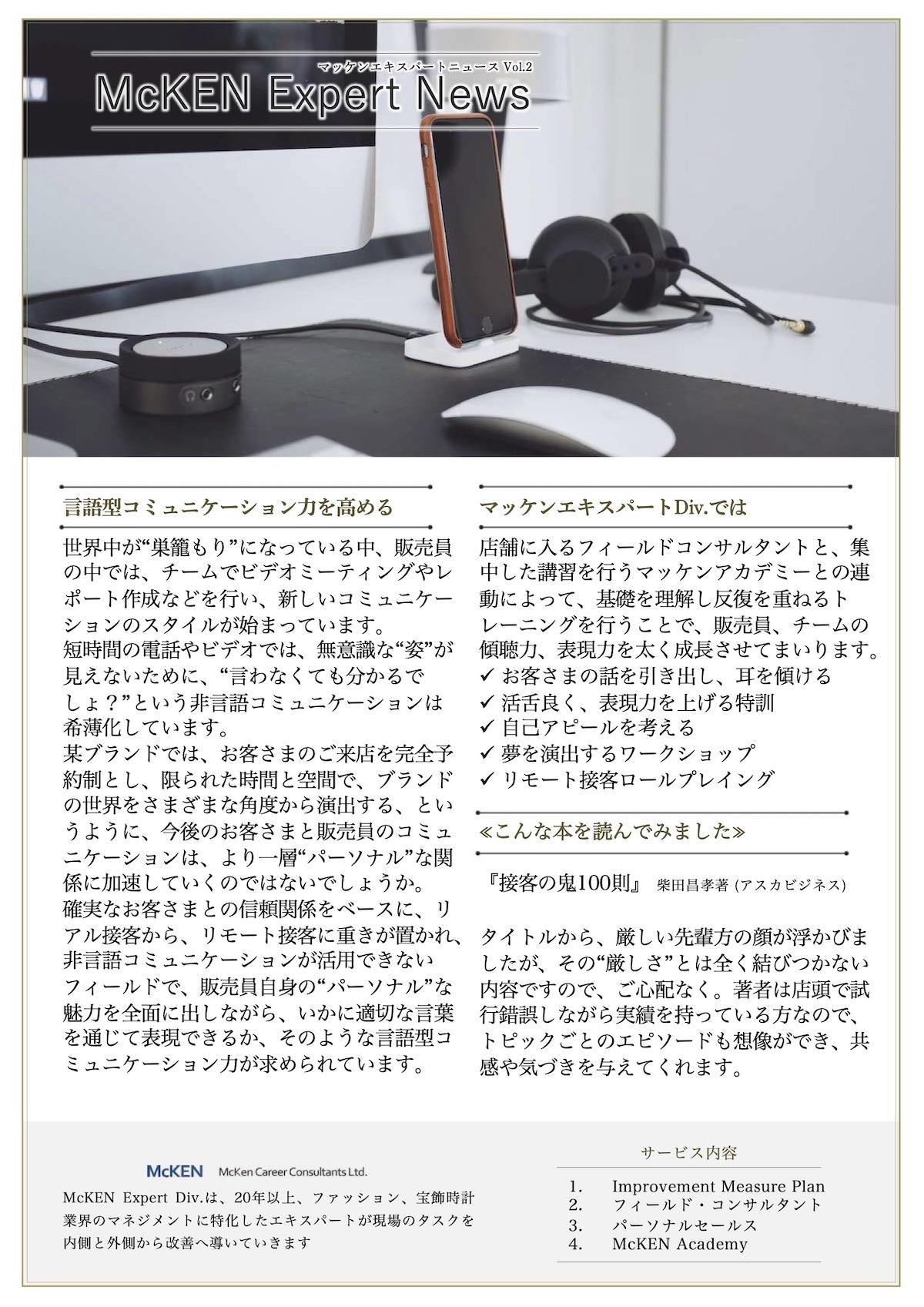 店舗に入るフィールドコンサルタントと、集 中した講習を行うマッケンアカデミーとの連 動によって、基礎を理解し反復を重ねるト レーニングを行うことで、販売員、チームの 傾聴力、表現力を太く成長させてまいります。