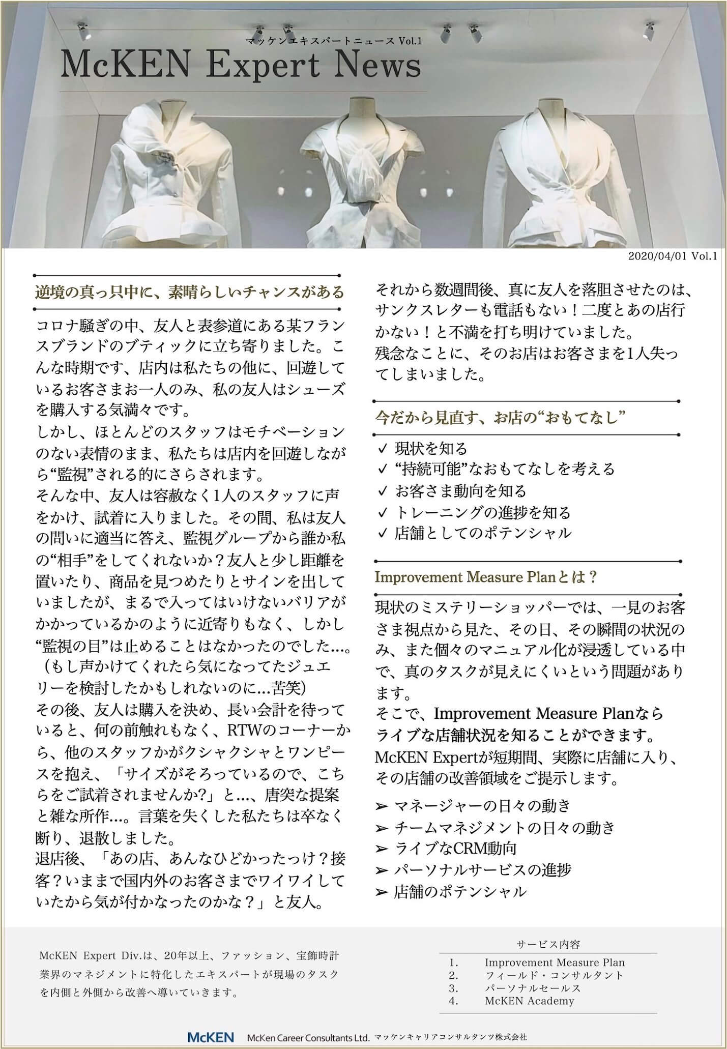 弊社McKEN Expert(マッケンエキスパート)部門は、20年以上ファッション、宝飾時計業界のマネジメントに特化したエキスパートが、企業様の『現場のタスクを内側と外側から改善へ導く』サポートを行うサービスです。