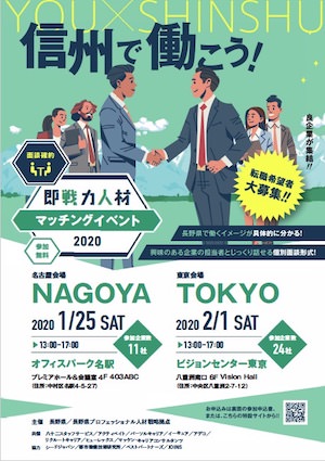 2020年1月/25日(土)、2月1日(土)に『「信州で働こう!」即戦力人材マッチングイベント』が開催されます。